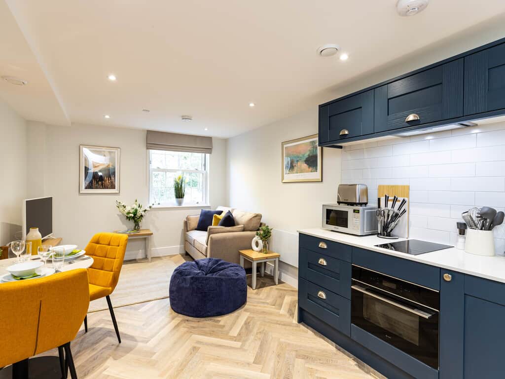 Cosy seating area with 2 seater sofa and Smart TV. Round dining table with 2 chairs. Well equipped kitchen with modern appliances