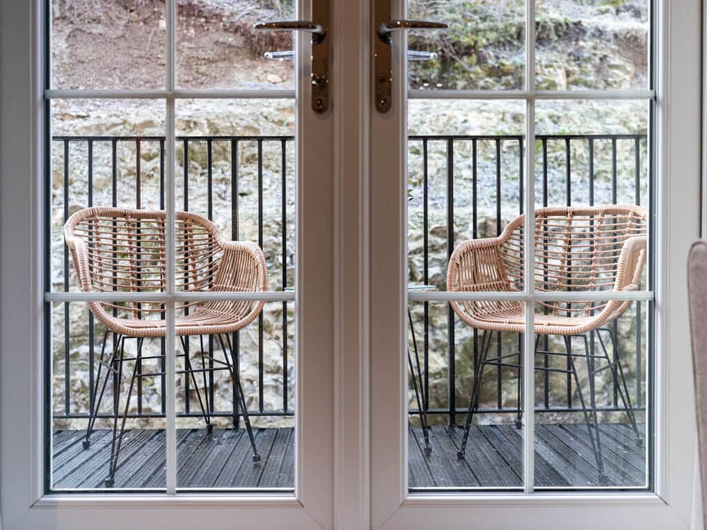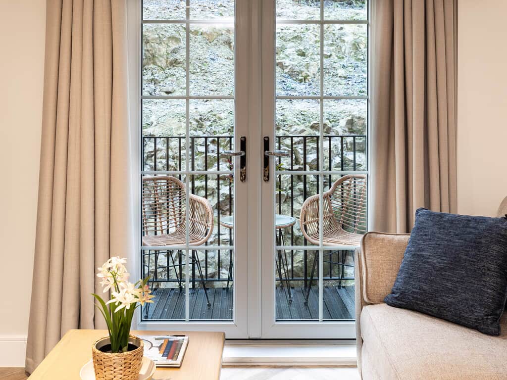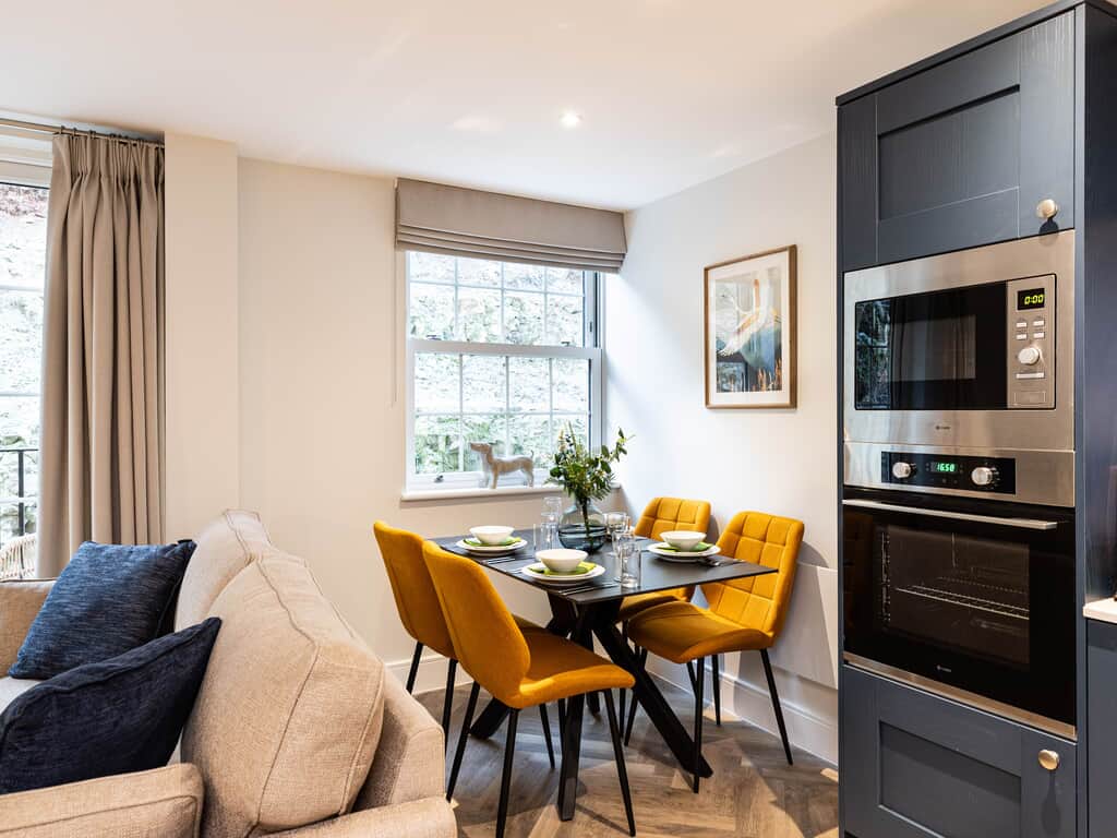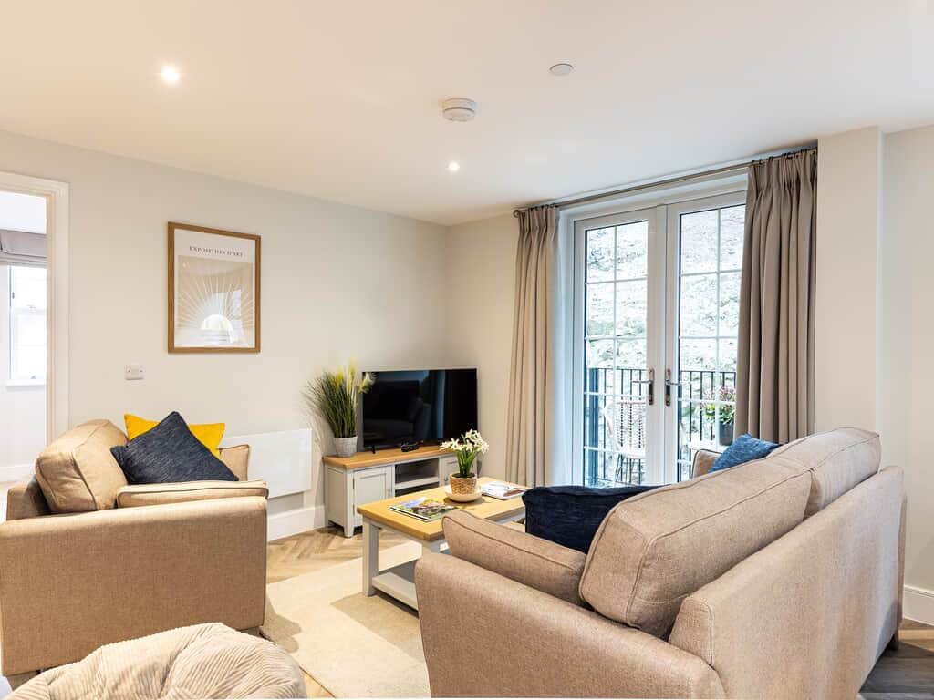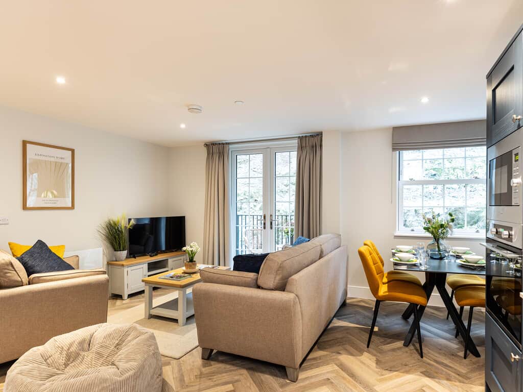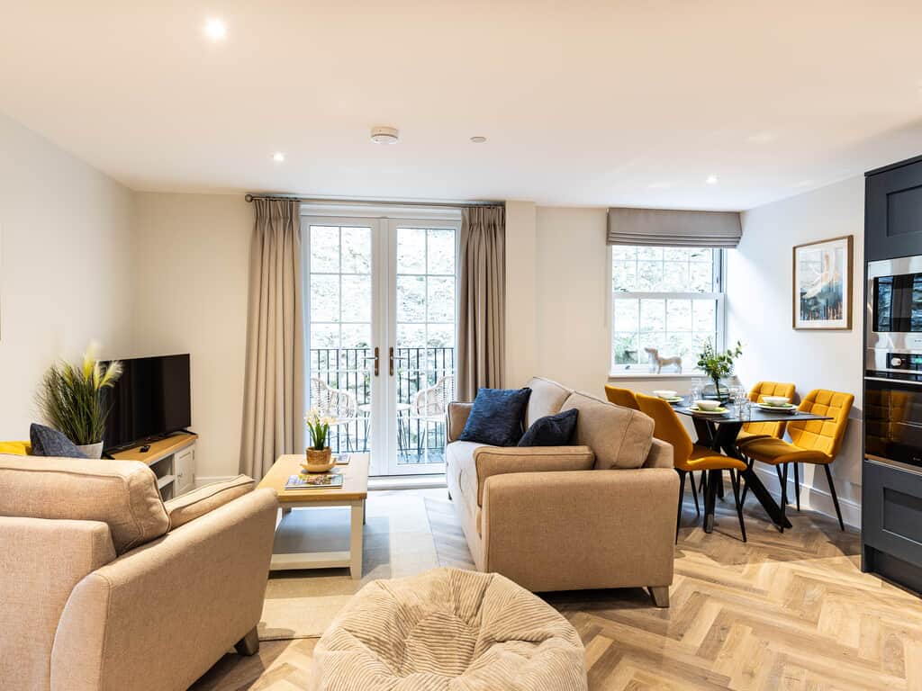 Luxury first floor apartment with balcony, offering a spacious cooking / dining and living area with soft furnishings and individual style. Cosy seating area with 2 seater sofa and armchair and Smart TV, French Doors lead to a small balcony. There is a dining table that can seat 4 guests.