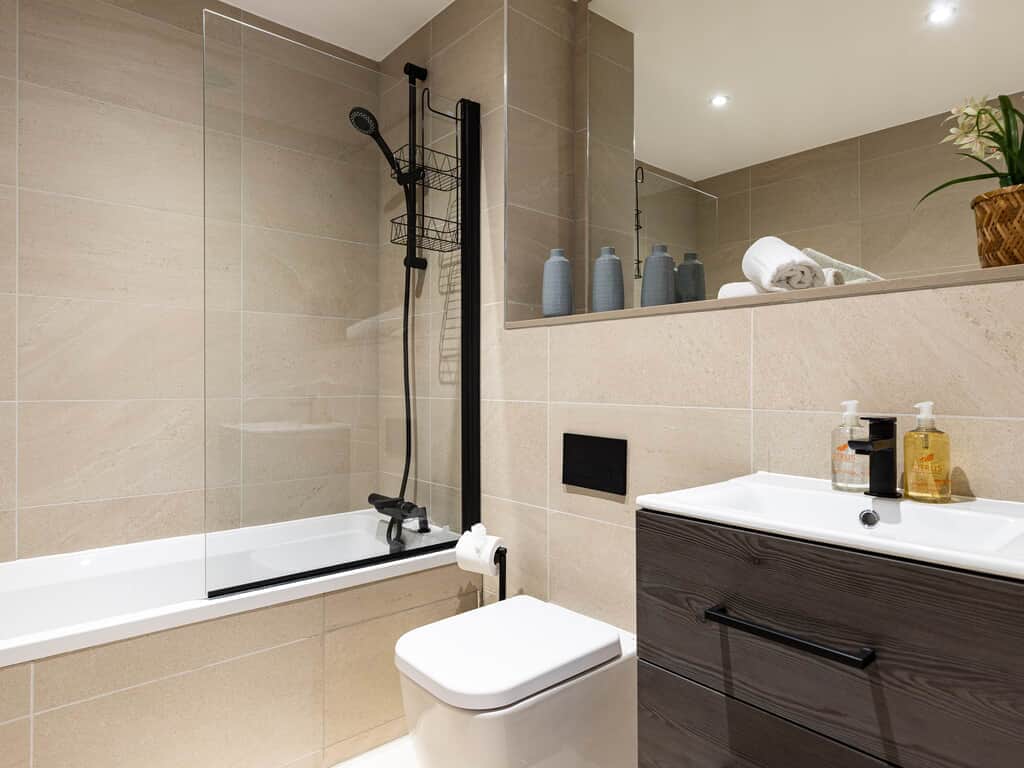 Stylish, modern bathroom featuring a bath with shower over, wash basin with 2 drawer storage and toilet. Underfloor heating.