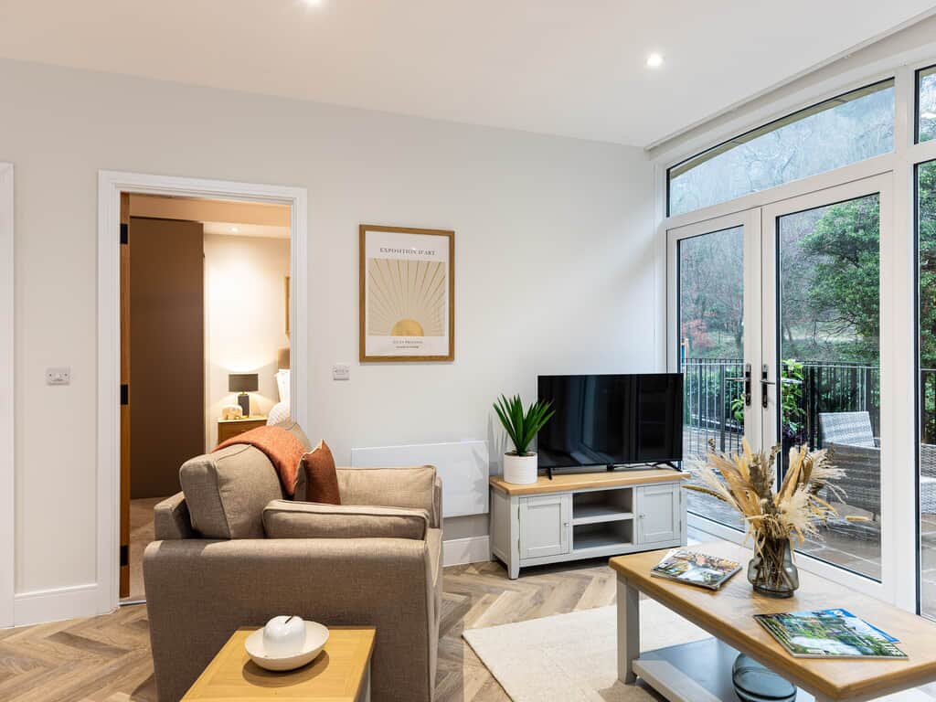 Cosy seating with 2 seater sofa bed and a comfy armchair, coffee table and Smart TV. Dining table to seat 4.