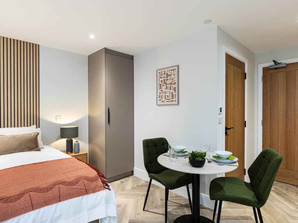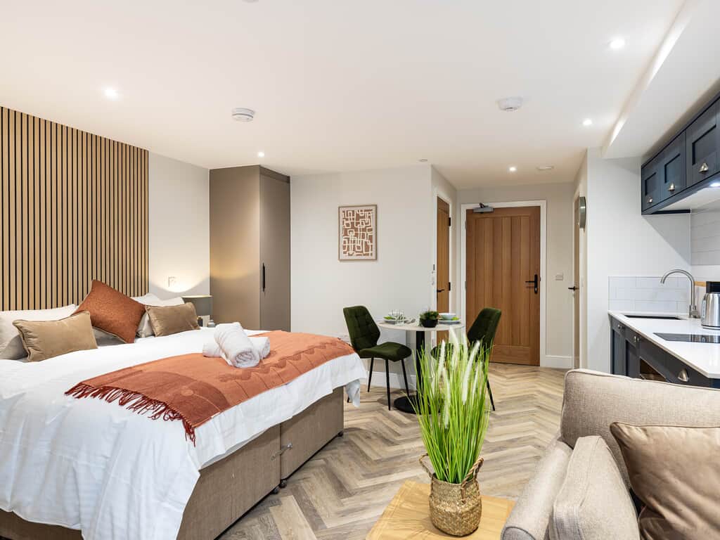 Spacious first floor studio apartment, offering a combined living, dining and bedroom space with a super king double or twin