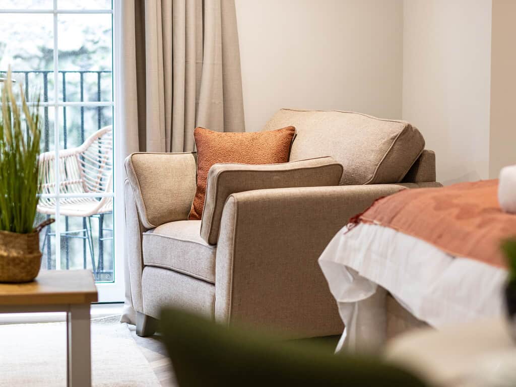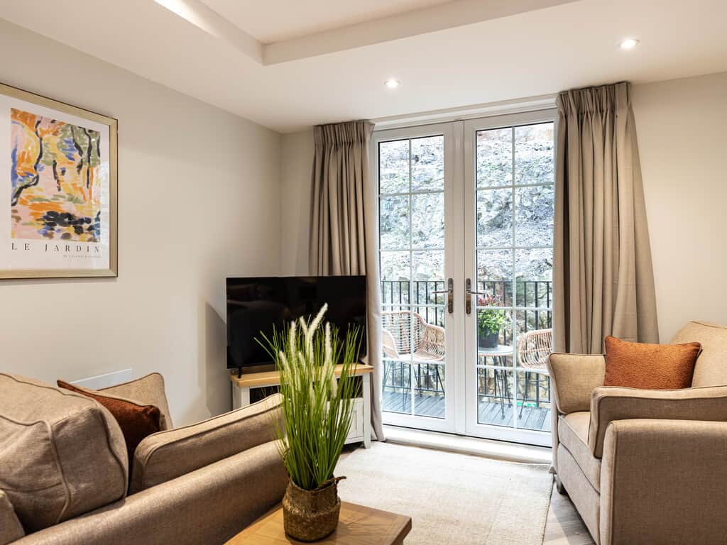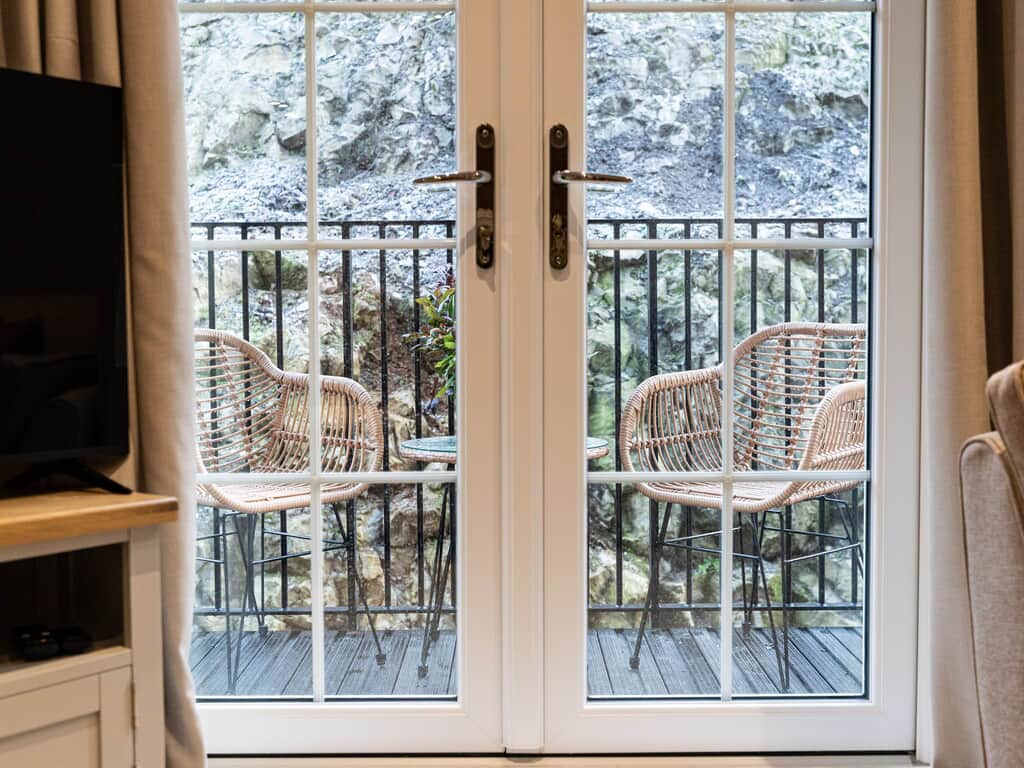Living area with 2 comfy armchairs, Smart TV. Dining table seating 2 people. French Doors lead to a small balcony.