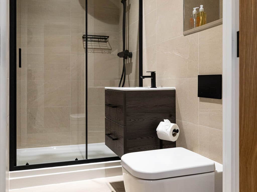 Modern shower room with large overhead shower head and separate hand held attachment with wash basin and toilet. Underfloor heating