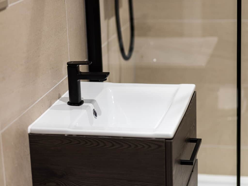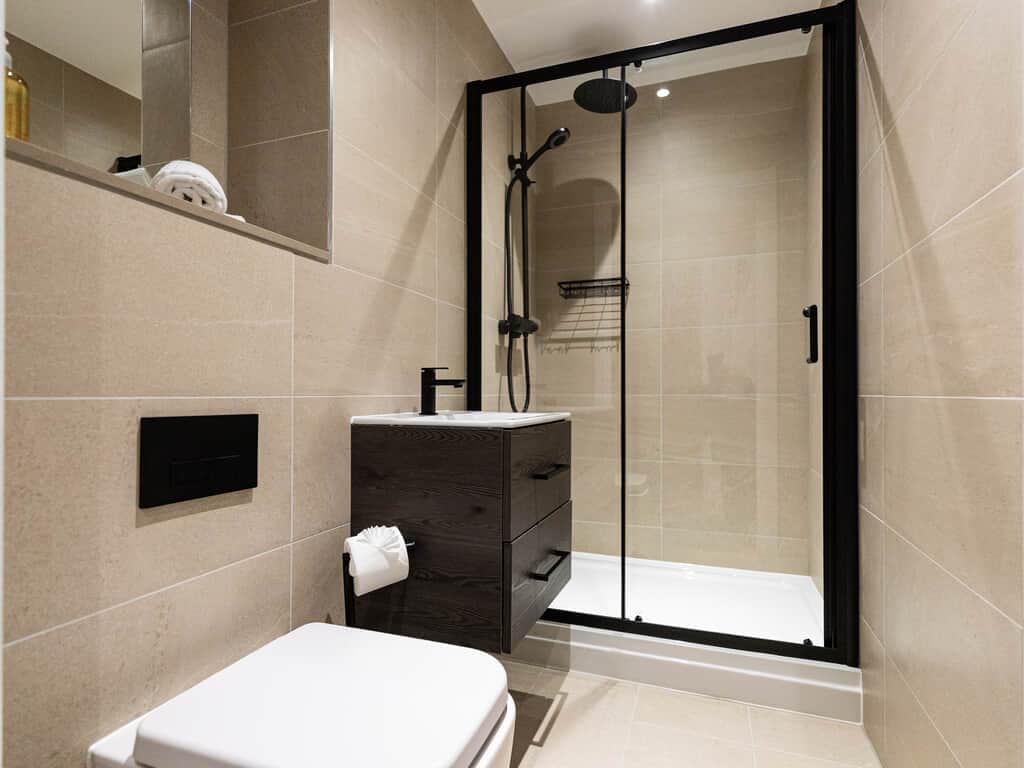 Modern shower room with overhead shower head and separate hand held attachment, wash basin and toilet. Underfloor heating
