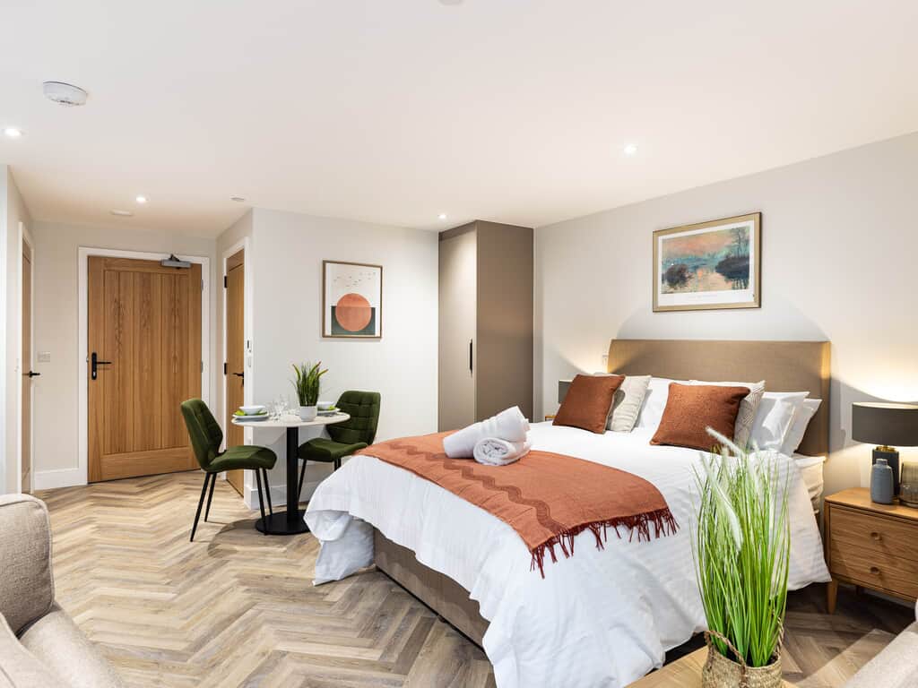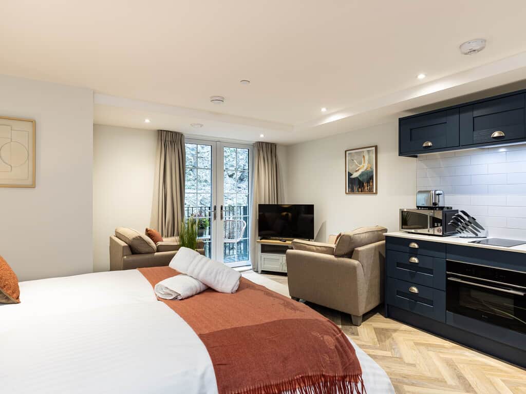 Spacious first floor studio apartment, offering a combined living / dining and sleeping space with fixed king sized double bed