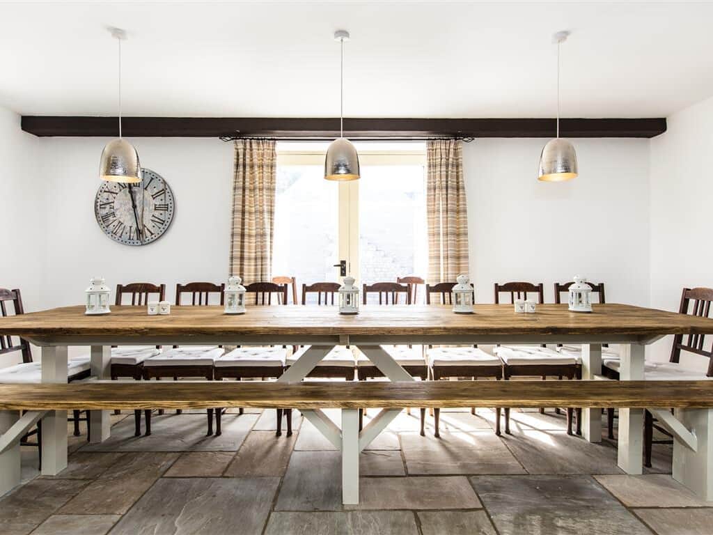 Large oblong dining table (250cm x 145cm) seats up to 18 guests with a mixture of benches and chairs.