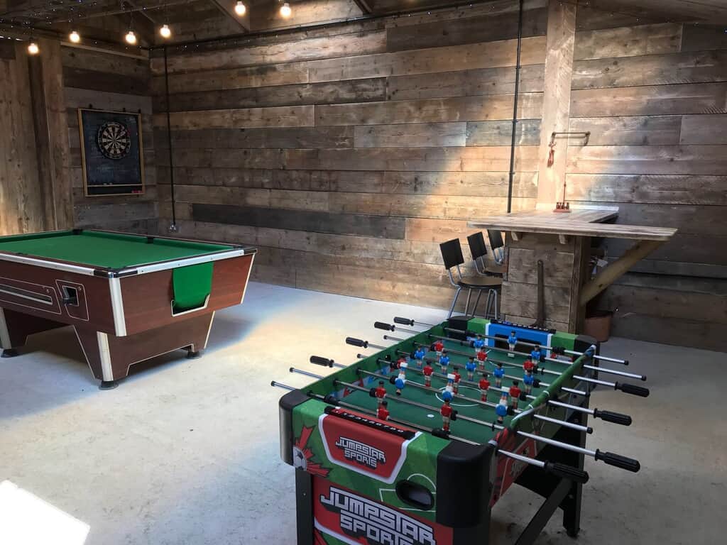 The games room is in a separate rustic barn at the rear of the house with, pool table, dart board, giant connect 4, sofa, plus heater operated by a self controlled timer