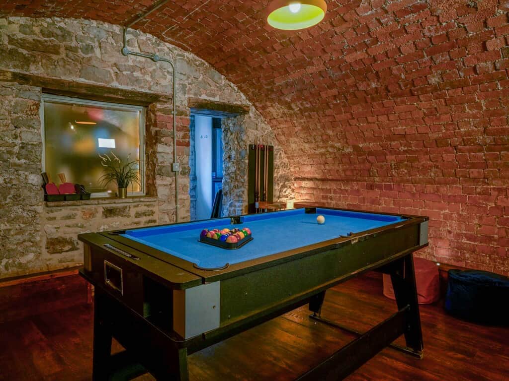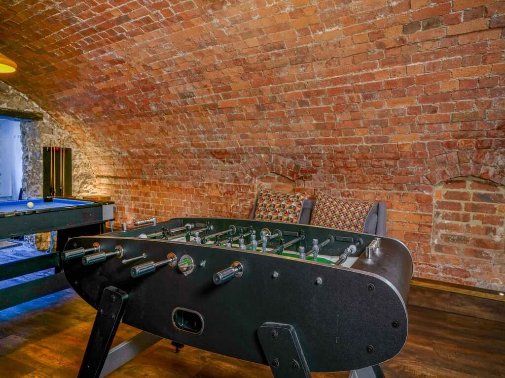Hidden away down a secret staircase you will stumble across this fabulous converted cellar. This rooms retains an authentic rustic feel with its exposed walls and clever floor lighting, creating a warm homely feel, the perfect ambience for guests to enjoy the multitude of games in this unique space: